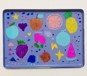 頂き物のお菓子の缶が綺麗な色で、蓋の裏にむすめと絵を描きました。アクリル絵の具やポスカなど、わりと何にでも描けて、透明感がある色を出せる画材が大好きです。