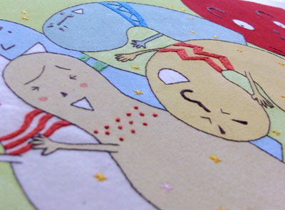 昨日のブログで紹介した、4作目の絵本です。刺繍と絵の具で描きました。