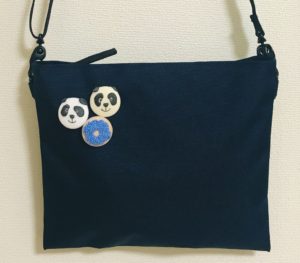 個展の際に使おうと思っているサコッシュに、くるみボタン(若干の失敗作)を付けました。