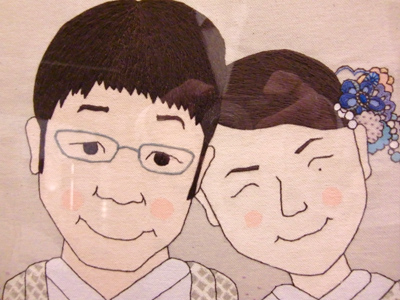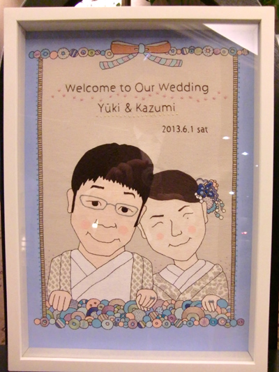 披露宴のウェルカムボードの依頼をいただき、似顔絵を夫が描いて、彩色と刺繍を