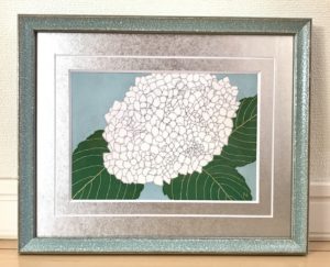 「アジサイ」です。銀色のマットを加工して仕上げていただきました。自分では絶対に選ばないマットですが、とても素敵だと思いました。個人的に額もすごく好きな質感です。