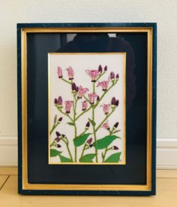 「ホトトギス」です。企画展に出展する植物シリーズの作品を全て素敵に仕上げていただきましたが、個人的に1番感動した額装です。「ホトトギス」は細かくて刺繍するのに苦戦したけれど描いてよかったなと思うほど、素敵な額装にまとめていただきました。こんな着地点が待っていたのかと思う感慨深い作品になりました。