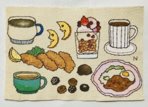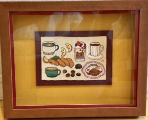 この絵は、むすめが生まれる前に描いた絵です。新たに額装をしました。インチサイズ(203×254mm)です。喫茶店をイメージして額装していただきました。