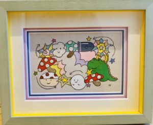「夏の思い出」という絵です。額はインチサイズ(203×254mm)です。マットの間にボードを挟み、飛び出た絵本のように仕上げていただきました。ポップな絵が、より楽しい雰囲気になりました。