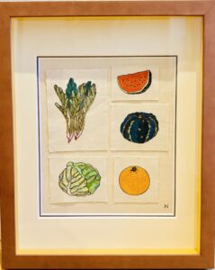 「お野菜と果物」という絵です。額は八つ切(303×242mm)です。ボックス型の額に入っていて、とても面白い絵になりました。