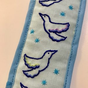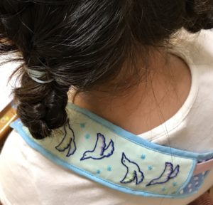 むすめの水筒のベルトカバーを作りました。花柄のほうは今まで使っていたもので、鳥の模様のほうが新しく作ったカバーです。