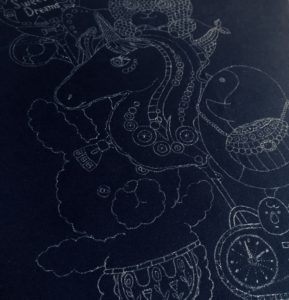 製作を始めたばかりの「よるふかく」という絵です。紺地にしっかりトレースが出来ました。あ〜、よかったです!